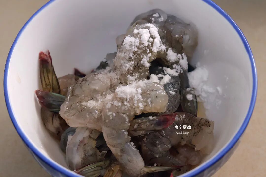 3、把虾仁装入碗里,然后放入淀粉、料酒和食盐搅拌均匀腌制5分钟,再放入热水中烫10秒变色后即可捞出沥干待用。