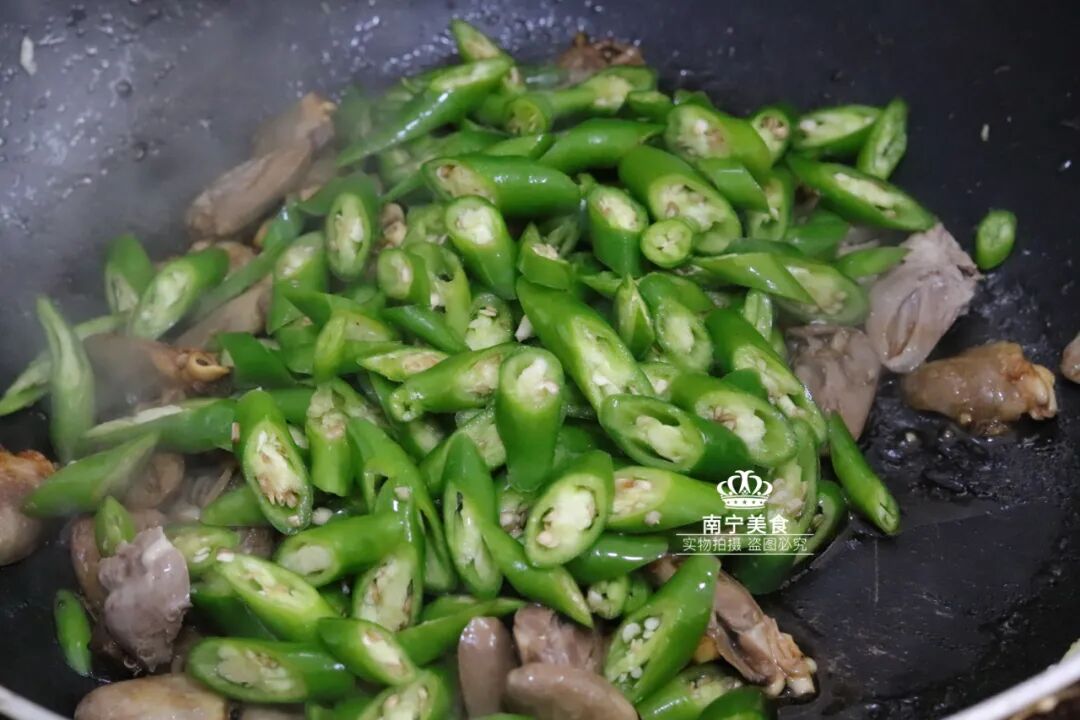 6、接着绿线椒倒进去一起翻炒出辣椒香味。