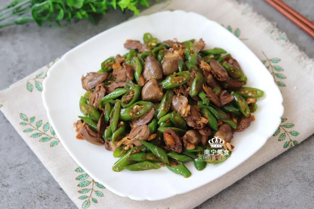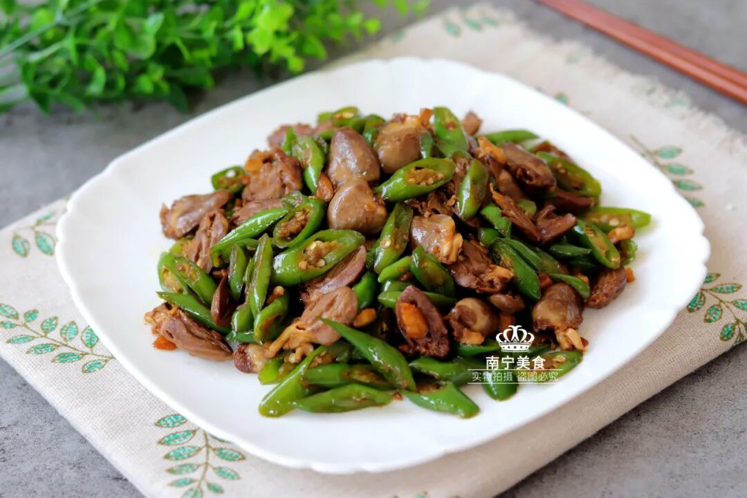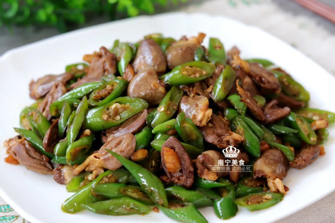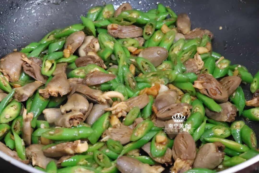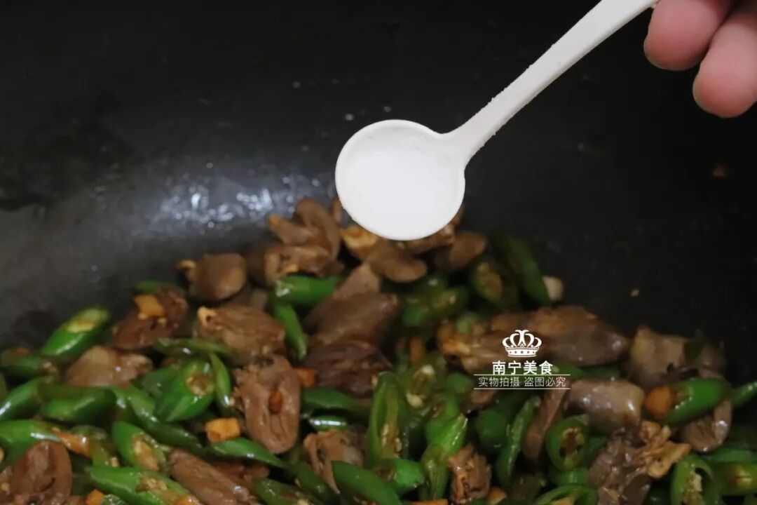 出锅装盘,一盘香辣又下饭的青椒炒鸡心就做好啦!