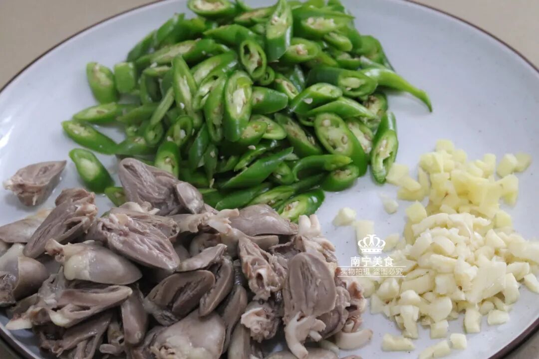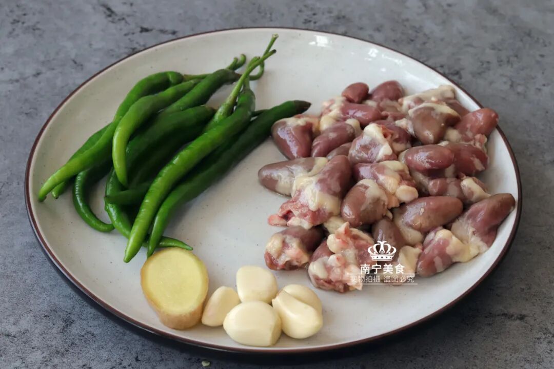 准备好食材:绿线椒200克、鸡心300克、大蒜4粒、生姜1块、生抽1勺、蚝油半勺、食盐1小勺。