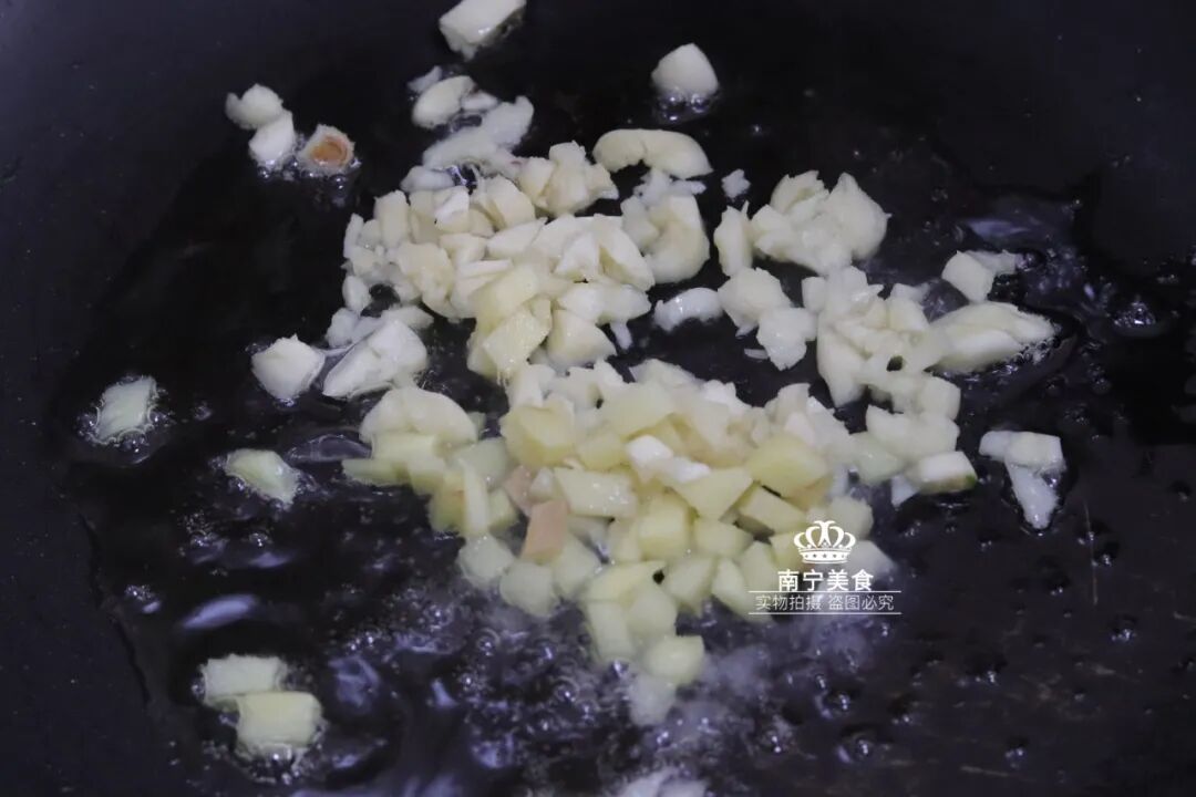 3、起锅,在锅里倒入适量的油,小火烧热,把蒜姜碎倒进去爆香。
