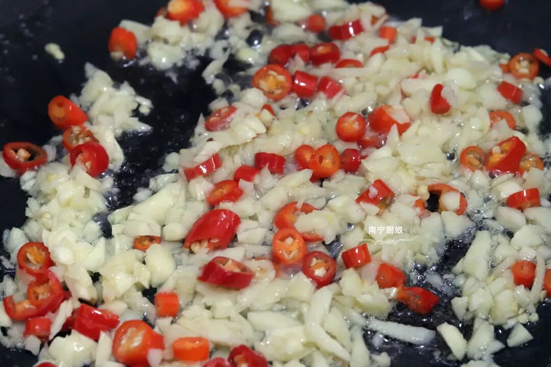 5、起锅,在锅里倒入少量油小火烧热,把姜蒜小红椒碎倒入翻炒香。