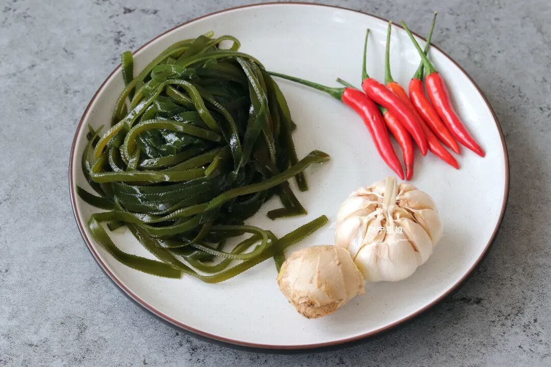 准备好食材:海带丝300克、大蒜1颗、生姜1块、小红椒6颗