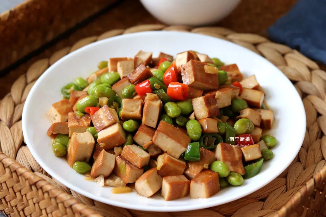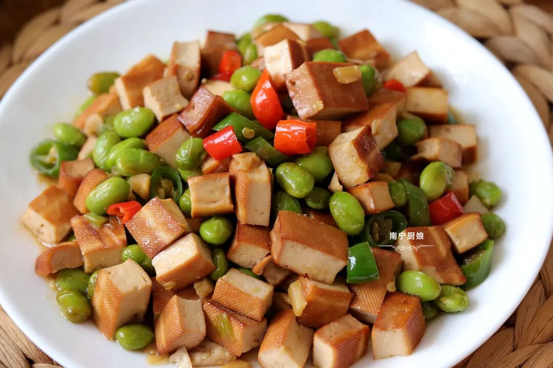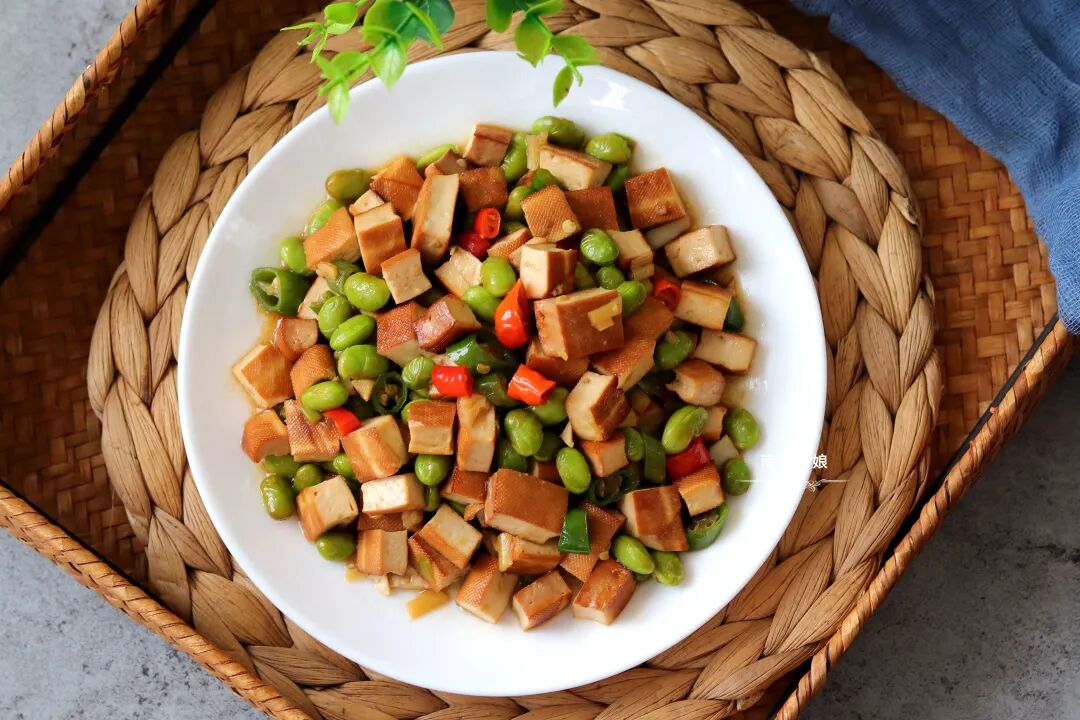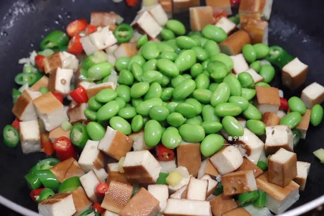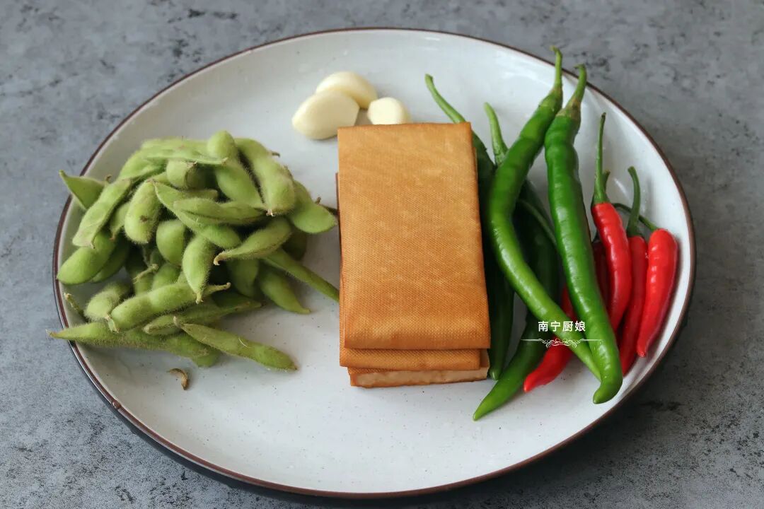 这道菜的主要食材就是香干、毛豆和辣椒,三种食材一起炒,下饭又下酒。