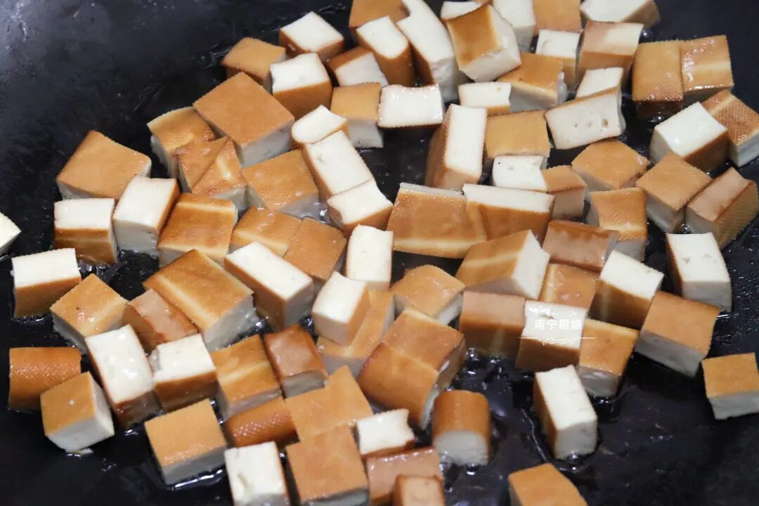 2、把香干切丁,起锅,在锅里倒入适量的油小火烧热,把香干丁倒入翻炒至表皮发黄。