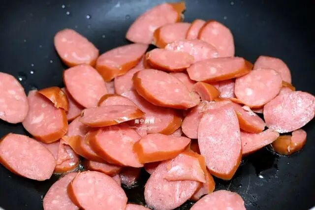 1、起锅小火烧油,锅中油烧热后,把香肠片倒入炒香,然后盛出装盘待用。