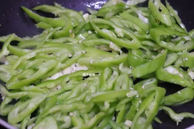 3、接着把青椒倒入锅中大火快速翻炒出辣椒香味,炒至8成熟。