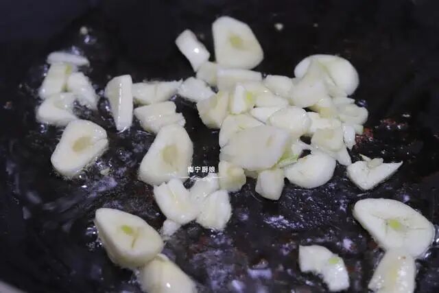 2、继续在锅里倒入少量油小火烧热,把大蒜倒入爆香。