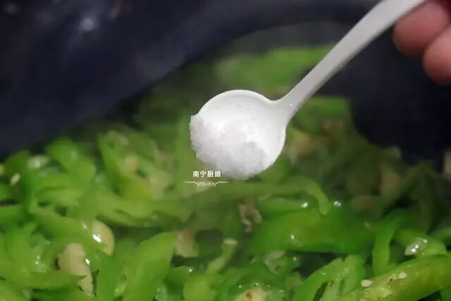 4、因为香肠已经自带咸味,所以我们单独给青椒加入食盐调味,翻炒均匀。