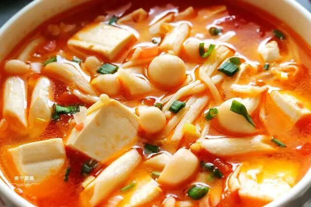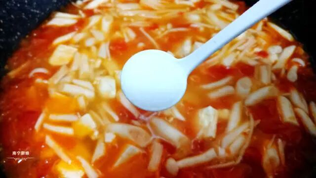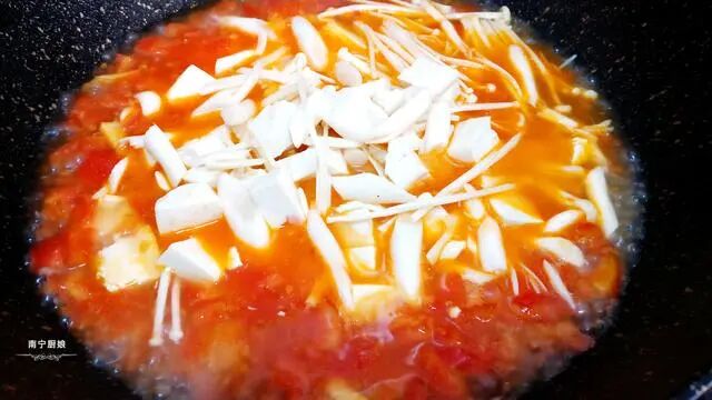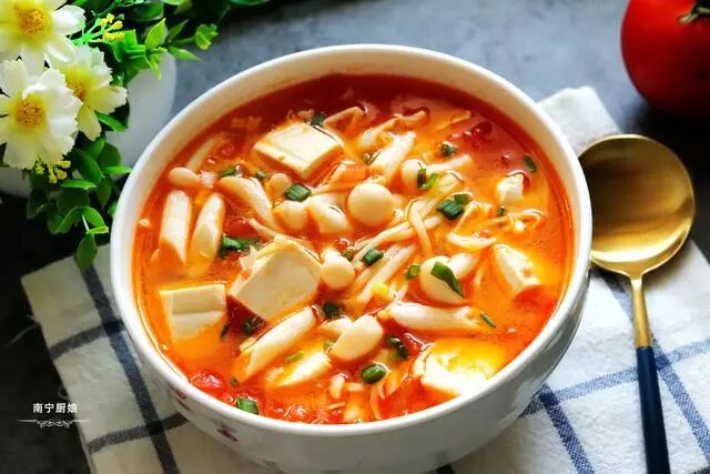番茄富含维生素C,豆腐富含蛋白质和钙质,海鲜菇和金针菇富含氨基酸和微量元素,用这几种食材搭配一起烧煮出来的汤汁,营养丰富又美味,春天可以多做给家人喝!这碗汤太好喝了,酸甜可口又鲜香,一周喝7次都觉得不过瘾。