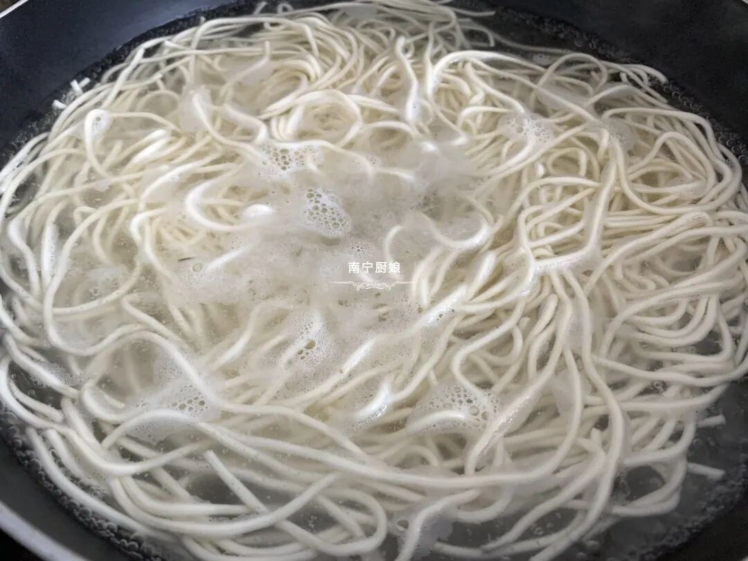 5、重新另起一个锅,烧热半锅水,下入面条,继续开大火烧煮沸汤水,等锅中汤水沸腾后,倒入一碗凉水,再加入几秒钟即可关火,把面条捞出来控干水分。(最后加入凉水,是可以让面条变得更劲道)