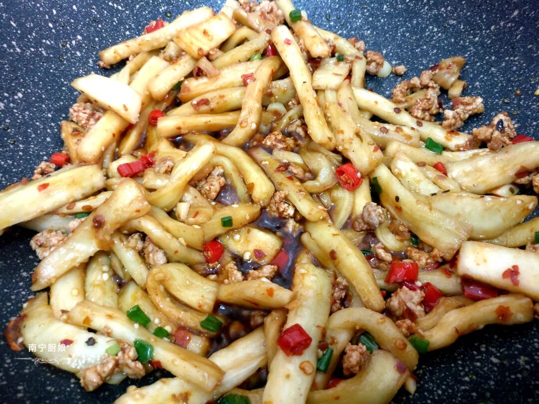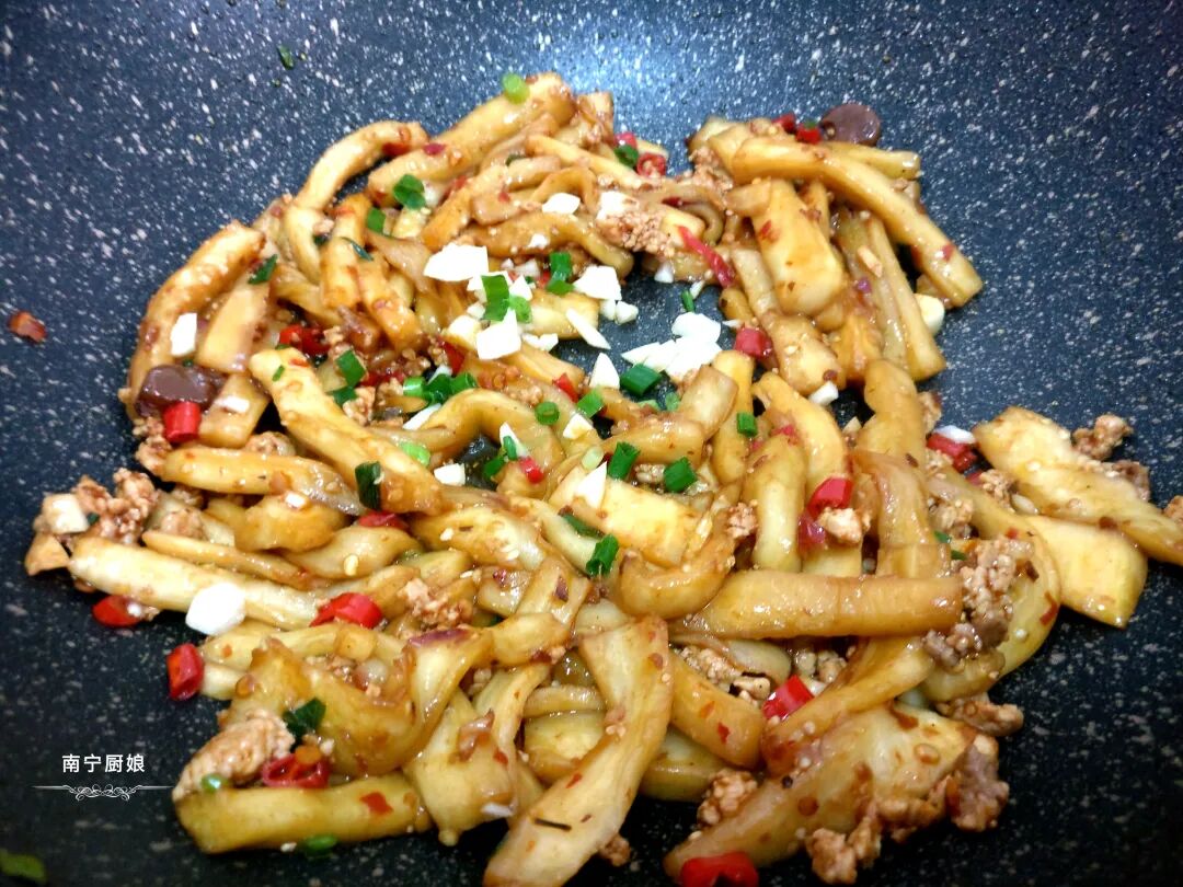 7、再把之前调制好的鱼香料汁倒入锅中和茄条翻炒均匀,然后小火烧煮1分钟,好让料汁充分的被茄条所吸收。
