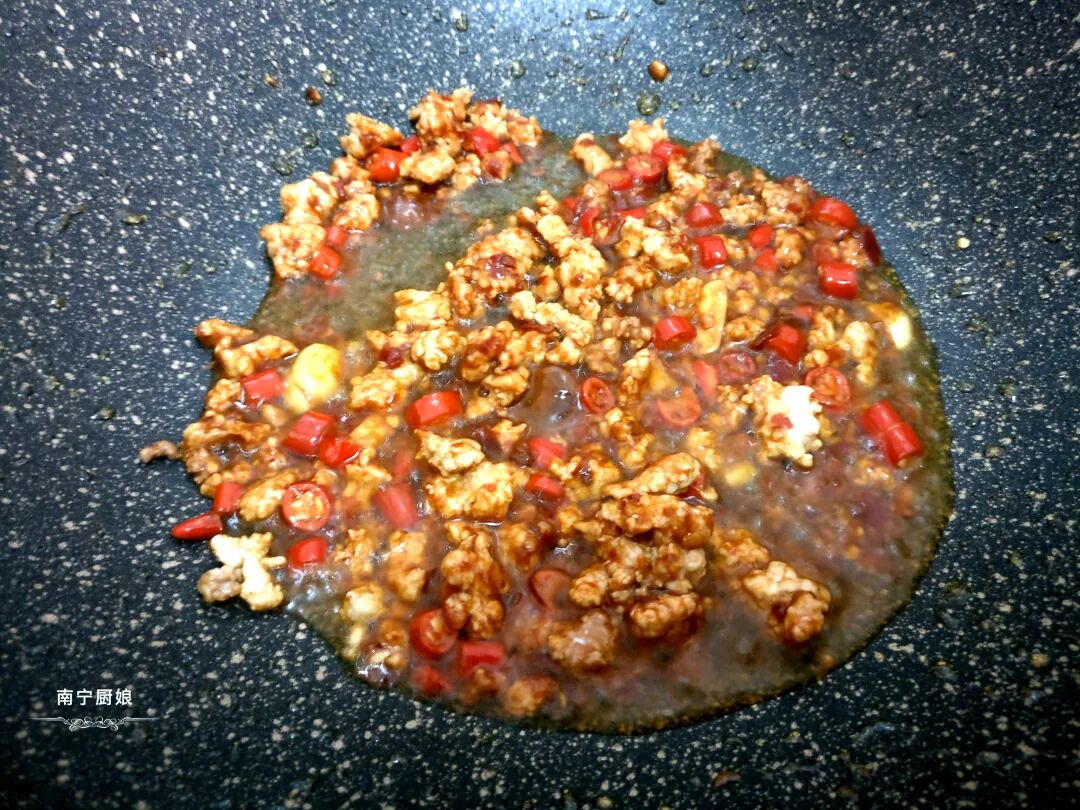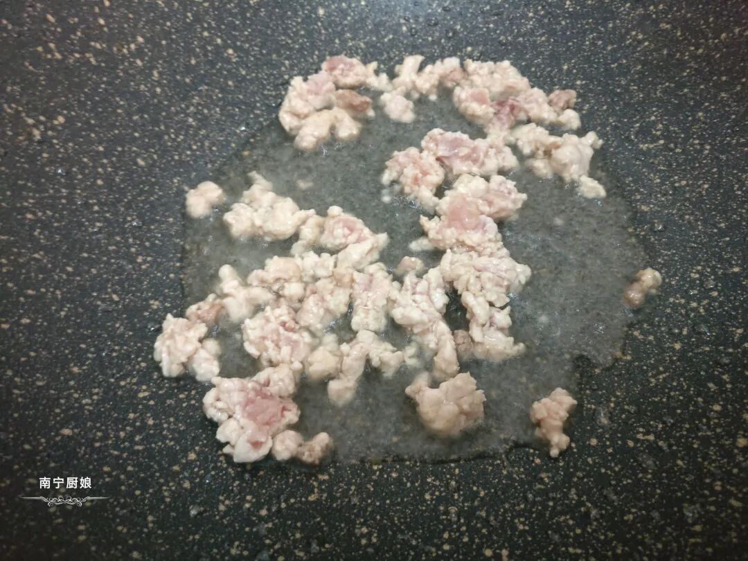 4、起锅,在锅里倒入适量的油,我们家喜欢用花生油,做菜挺香的,小火烧热油之后,再把肉末倒入翻炒至变色。