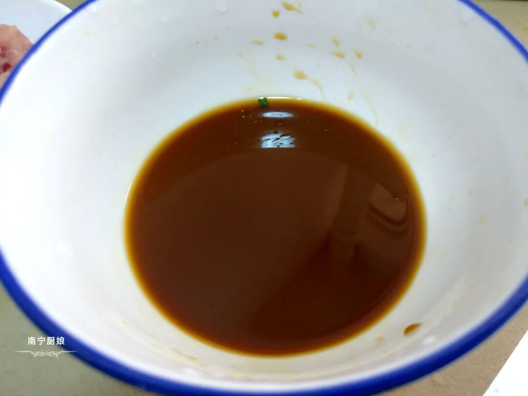 3、我们来调制一碗鱼香料汁:1勺生抽、1勺陈醋、一汤匙白糖、1勺料酒,一勺淀粉一起搅拌成料汁待用。