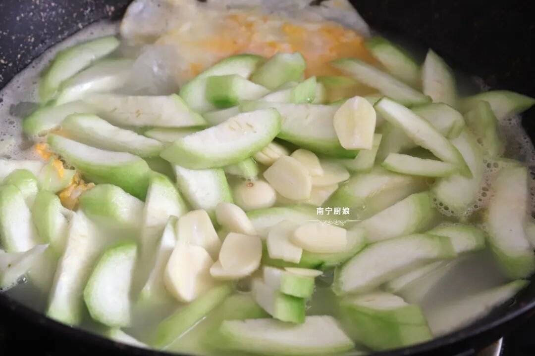 4、接着把丝瓜和大蒜也放入锅中,烧至汤水慢慢变成迷人的乳白色。