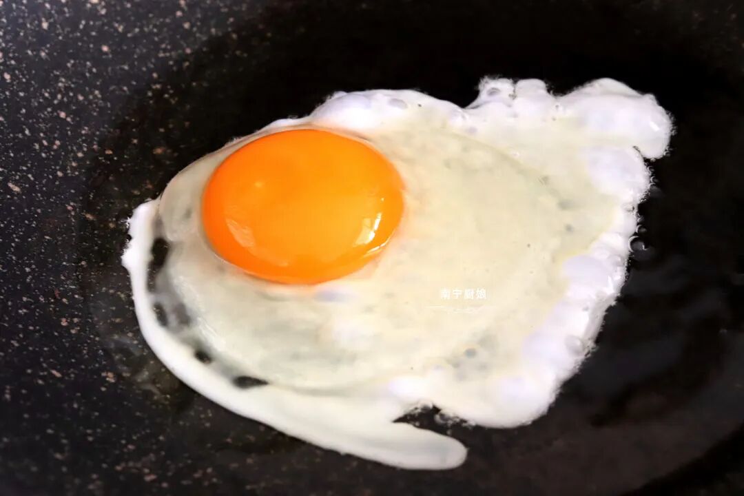 2、在锅里倒油,开大火烧热油,把鸡蛋打入,煎至两面金黄。