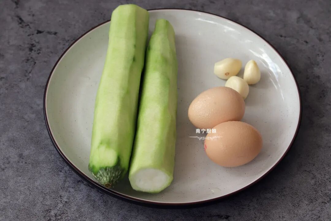 准备好食材:丝瓜1根、鸡蛋2颗、大蒜3粒、食用油2勺、食盐1勺。