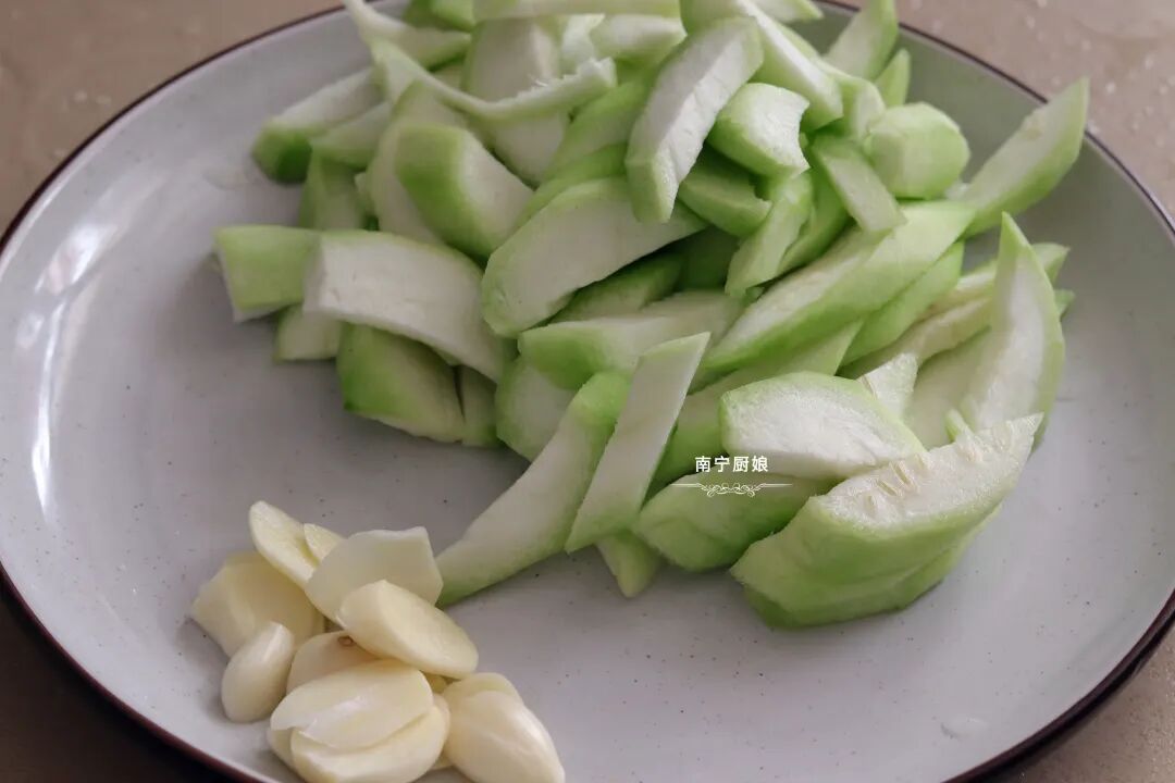 1、把丝瓜刮皮后切条,大蒜去皮后切片装盘待用。