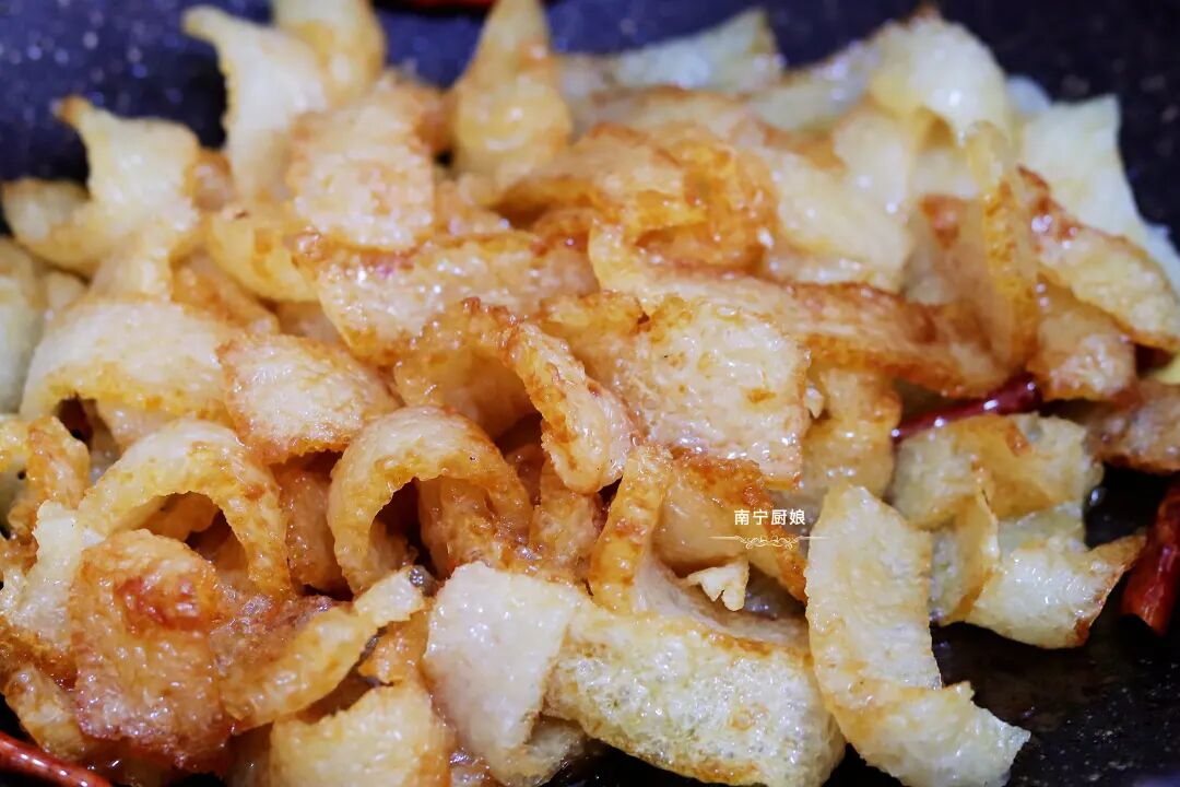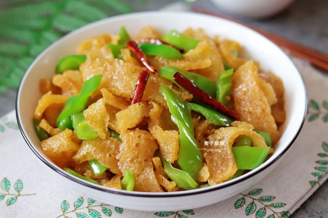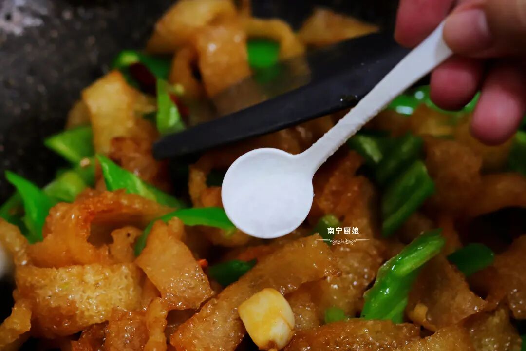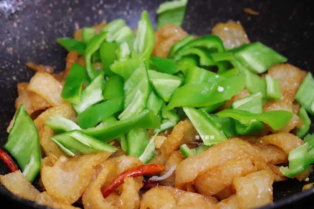 猪皮因为本身油炸过了,所以自带酥香,然后在烹调的过程中,也很容易吸收调味和青椒的鲜香,吃上一口也是酥中带脆,越吃越上瘾。