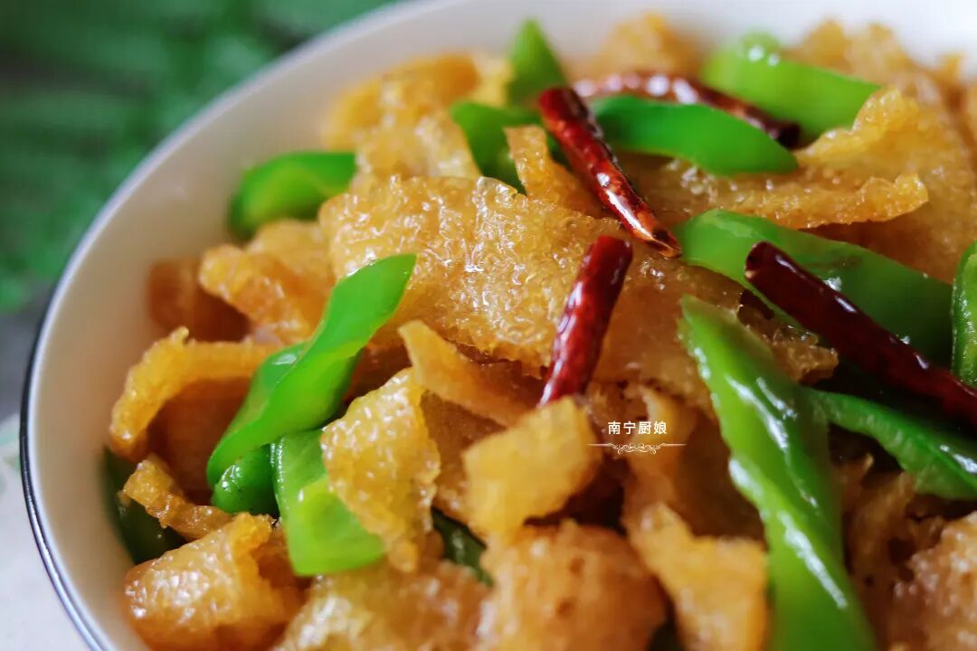 青椒鲜辣脆口,十分下饭,以前总觉得青椒炒肉足够好吃了,没想到今天把猪皮和青椒搭配一起炒,简直可以秒杀青椒炒肉几条街,比青椒炒肉好吃10倍都不为过。