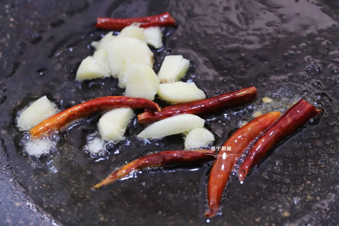 1、起锅烧油,小火烧热锅中油,把干红辣椒和大蒜倒入爆香。