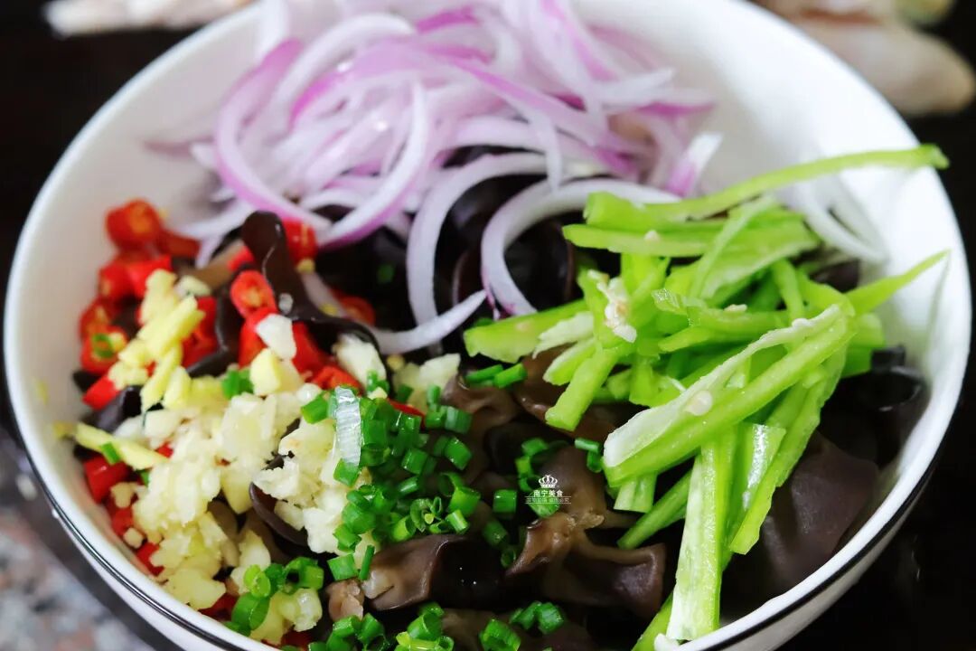 3、把沥干水分的木耳放入大碗中,依次放入洋葱丝、青椒丝、葱姜蒜末。