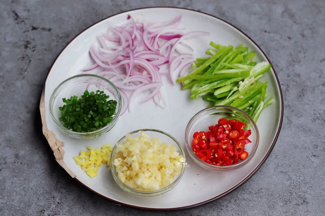 2、把青椒洗净后去籽切丝,洋葱切丝,香葱洗净后切碎,大蒜去皮后切碎,红尖椒洗净切碎,生姜切碎待用。