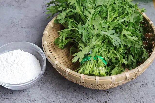 准备好食材:茼蒿1把、糯米粉300g、白糖、食盐、食用油。