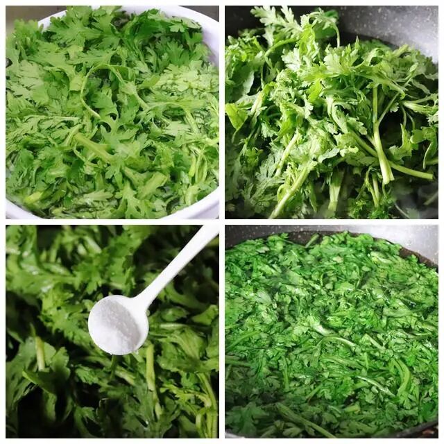 2、在给茼蒿焯水之前先向烧好的水中加点食盐和食用油,能够保持茼蒿的颜色。