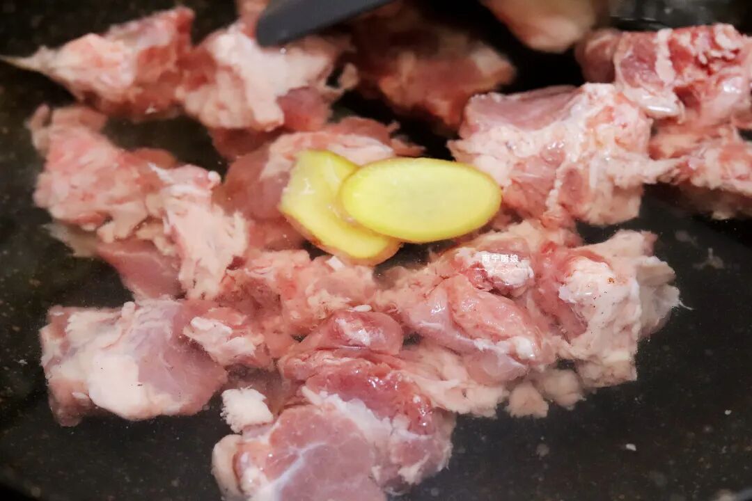 1、先把排骨在水龙头下冲洗1遍,然后放入锅中,切上2片生姜片,倒入没过排骨的凉水,开大火烧热水焯水。(排骨焯水一定要用凉水,然后再开火烧热锅中水来焯水,如果先烧热锅中水,再把排骨放入焯水,排骨的肉在接触热水后,马上收缩,里面的血水却没办法排出来,这样焯水出来的排骨腥味比较重,汤水也不鲜甜。)