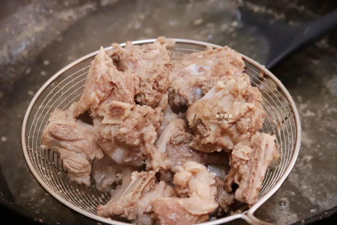2、排骨焯水好后,用滤网捞出,再用温水把排骨上的浮沫给冲洗干净。