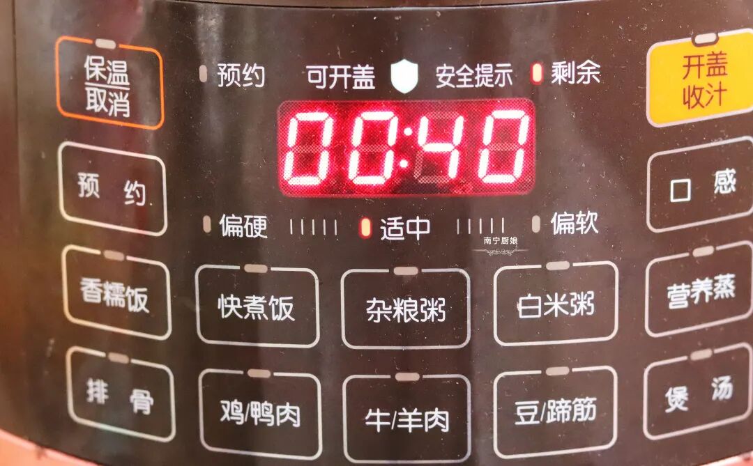 5、盖上锅盖,选择煲汤按键,让电压力锅自动煲煮40分钟即可。