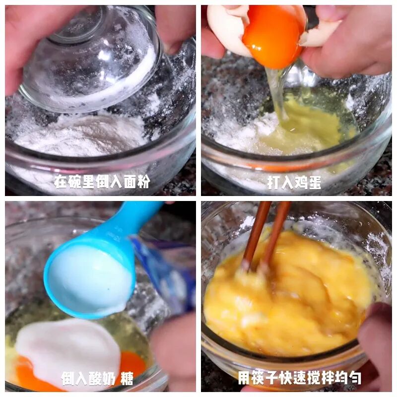 2、在碗里依次放入面粉、打入一个鸡蛋、酸奶、白糖,一起搅拌均匀。