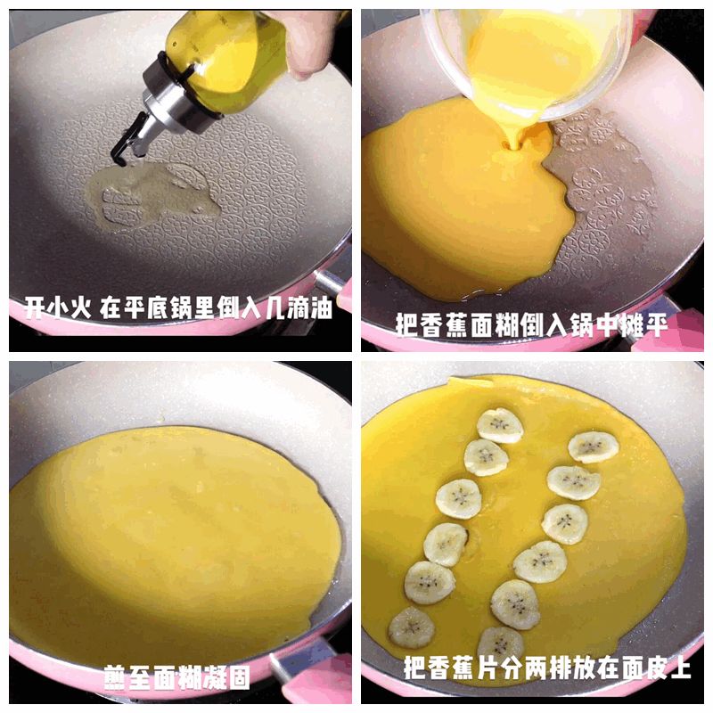 3、开小火,在平底不粘锅中滴入几滴食用油小火烧热,把搅拌好的鸡蛋液倒入平底锅中,把鸡蛋液平铺在锅底煎至凝固,然后在鸡蛋面皮上分两排放上香蕉片。