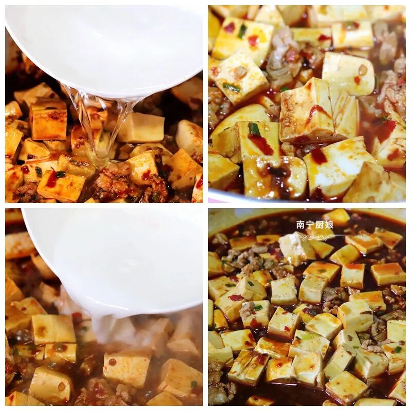3,在锅中倒入小半碗清水,大火烧开,让豆腐与肉末还有其它调味料一起在水中“相亲相爱”,做到“你中有我,我中有你”,等汤汁收至一半的时候,将淀粉倒入盛有少量温水的碗里搅拌均匀,然后一边慢慢倒入锅里,一边翻炒,让淀粉能充分融入,这时候汤汁就会慢慢变得浓稠,豆腐的上色也更深。