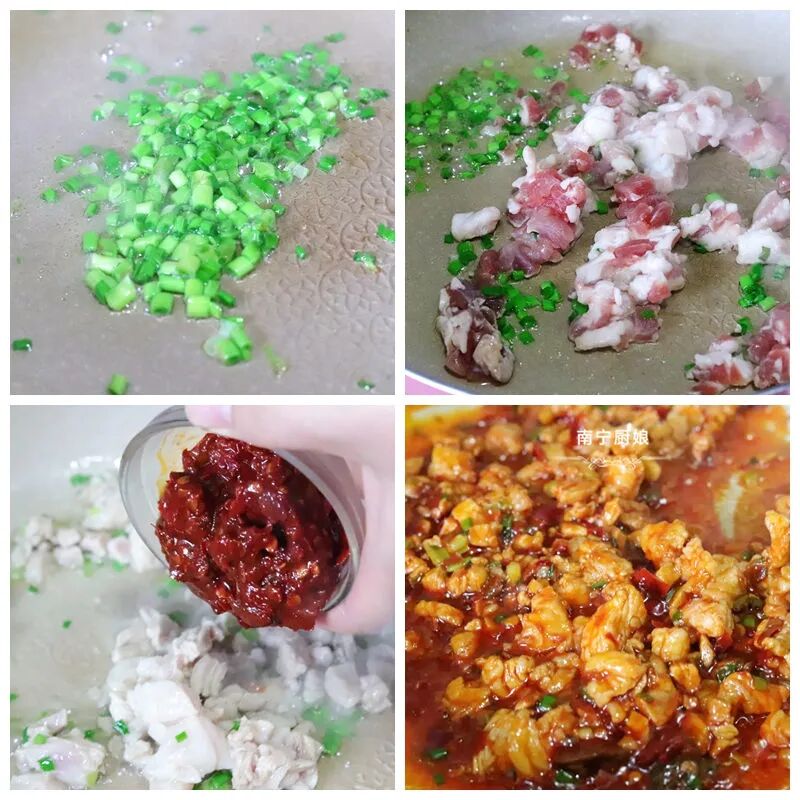 1,锅烧热放油,将蒜末(家里蒜子不多了要省着用,所以用蒜叶代替,味道差不多)放进去炒出香味,然后将剁好的肉末放入其中翻炒至5、6成熟的样子(表面变成白色,但细看里面还有点红),这时候豆瓣酱放进去,与肉末一起翻炒均匀,炒出红油。