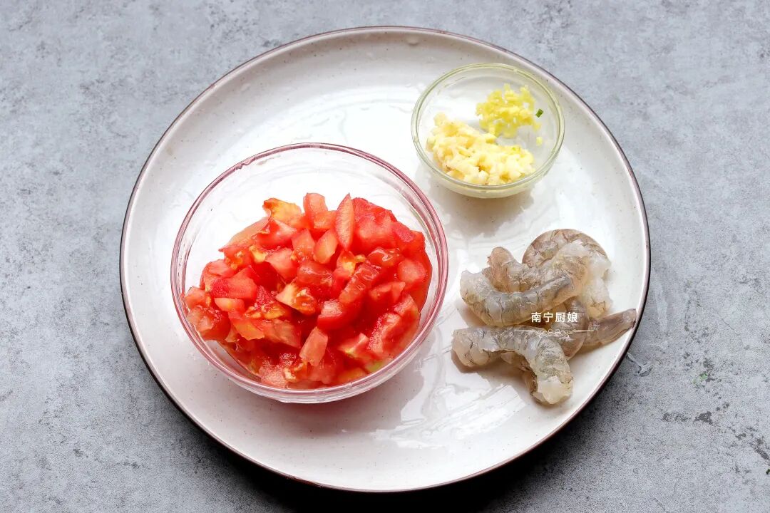 所需食材:虾、西红柿(番茄)、鸡蛋、黑胡椒、姜、蒜子、盐、油
