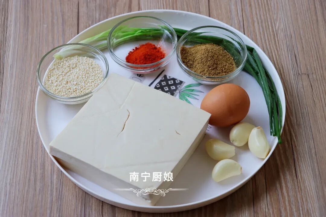 准备好食材配料:北豆腐1块、土鸡蛋一颗(普通鸡蛋也可以)、大蒜4粒、香葱1根、孜然粉50克、白芝麻50克、辣椒粉30克、生抽2勺、蚝油1勺、白糖半勺、食盐小半勺、淀粉3150克。
