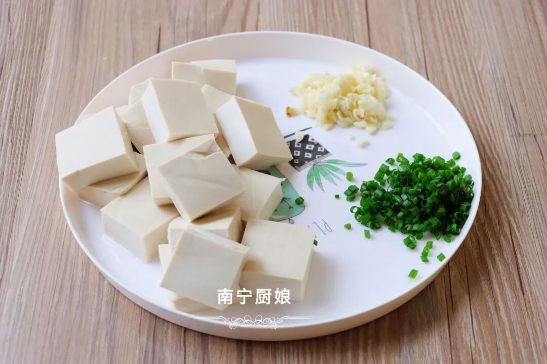1、把北豆腐切成小方块,大蒜去皮后切成末,香葱洗净后切碎装盘待用。
