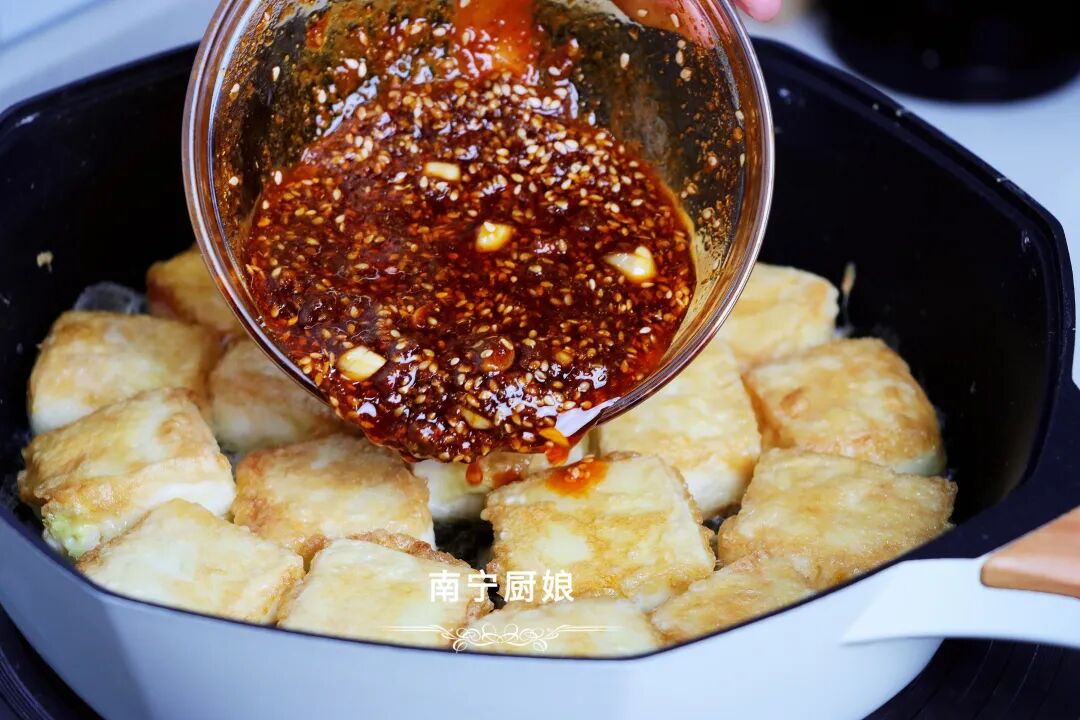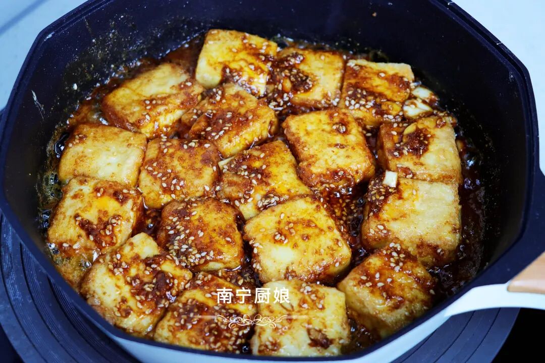 6、豆腐都穿上了焦黄色的“外衣”后,我们把之前调制好的料汁均匀的浇灌在豆腐块上,把料汁烧至沸腾冒泡,端起锅体晃动下,再用锅铲小心翼翼地给豆腐块翻个面,好让豆腐块均匀的入味沾上料汁。