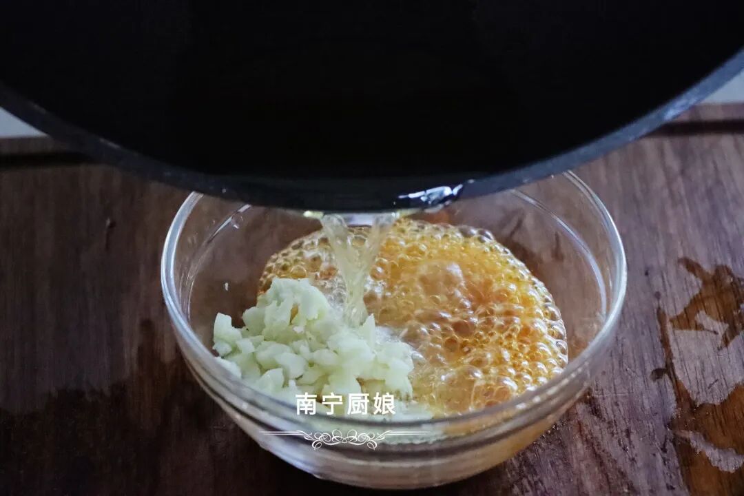 2、在锅中烧热适量油,然后倒入装有蒜末的碗中爆香大蒜,把蒜香味爆出来。