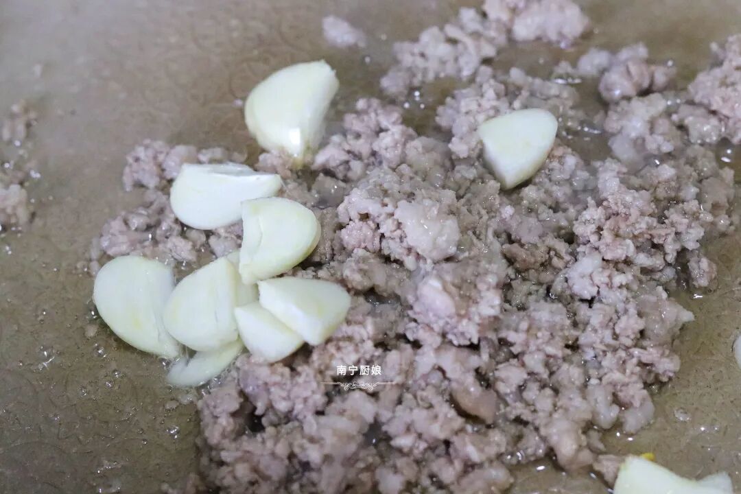 2、然后锅中放入少许的食用油,锅中油温七成热后把提前剁好的肉沫儿下入锅中进行翻炒。我们用小火来炒,可以将肉本身的油脂炒出来,肉香味也会激发出来。然后下入蒜片,改中火进行翻炒爆香。