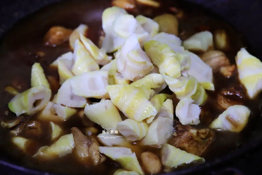 5、翻炒均匀后再加入400毫升的水,调至大火煮开后,把春笋倒入锅中,盖上锅盖,再调至中火煮10分钟左右。