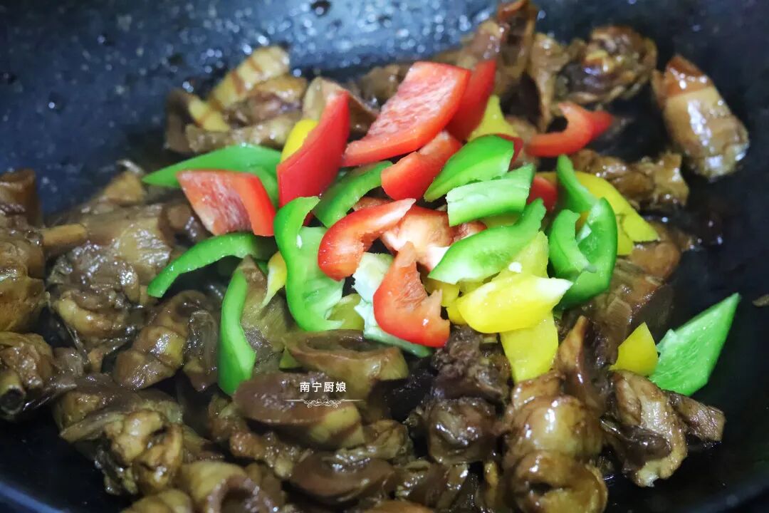 6、打开锅盖,取出葱段,把彩椒块倒入锅中翻炒均匀,适量地再加一些盐,然后调至转大火收汁,等汤汁变得浓稠以后就可以关火出锅啦!