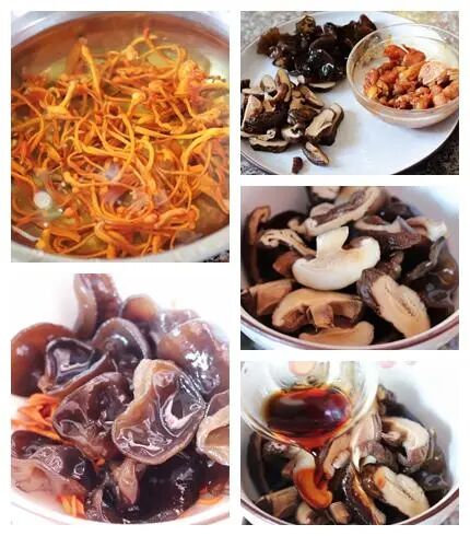 2、木耳泡在水里,将香菇洗净,然后把泡发的木耳、香菇和虫草菇放在一个碗中,放一些生抽,和匀,先给这些菜加点底味。