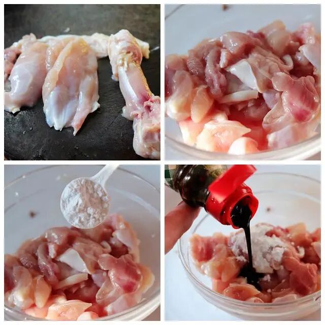 1、先把鸡腿去骨,把肉剔下来以后切成小块状,取一只碗,装好鸡肉后用上述的调味料腌制一下,记得把调味料和鸡肉和匀哦。