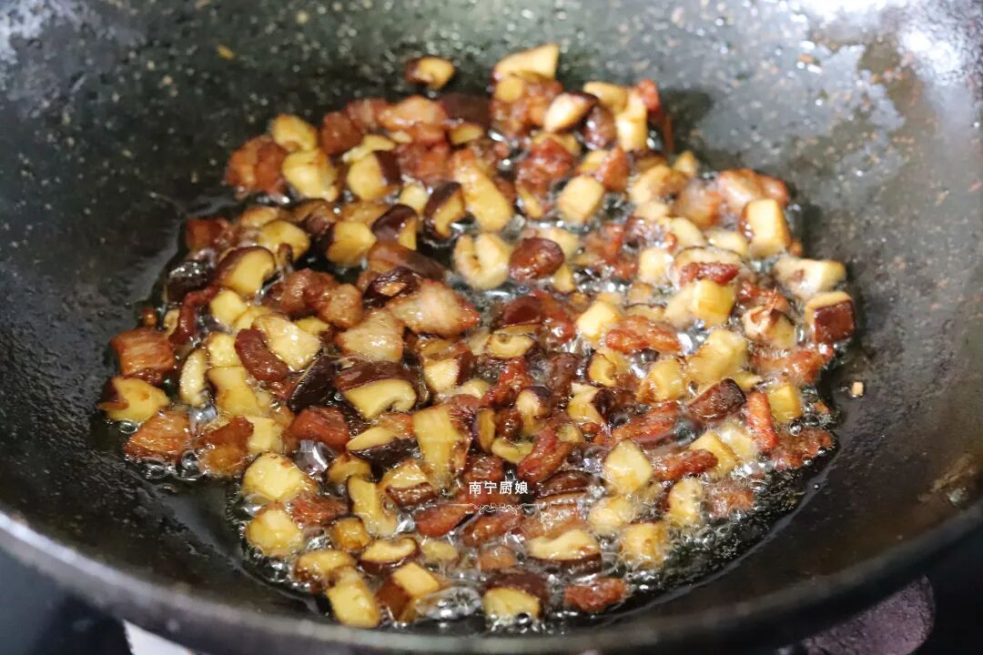 第三步,把香菇丁倒入锅中和五花肉丁一起不断翻炒,直到香菇水分被挥发变干瘪,炒至香菇丁颜色变黄,出现微微焦黄的状态,就能把浓浓的香菇味给逼出来了。