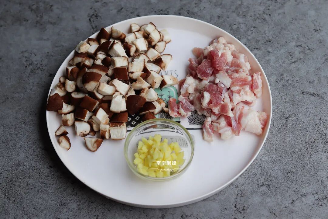 第一步,把去皮的五花肉洗干净,切成丁备用。把生姜洗干净切成姜末备用。把香菇洗干净,切成丁备用。