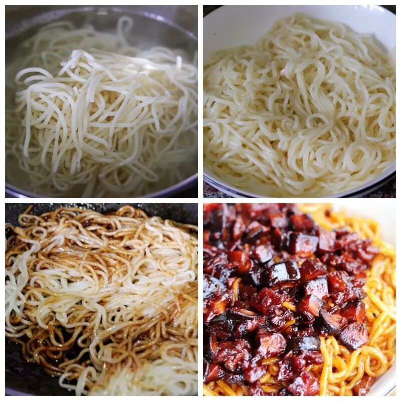 第五步,把锅洗干净,放入水,水沸腾后放入面条,把面条煮熟,煮熟后捞起来。再把刚才炒好的香菇五花肉酱和面条搅拌均匀,香气四溢的香菇肉酱面就做好了!