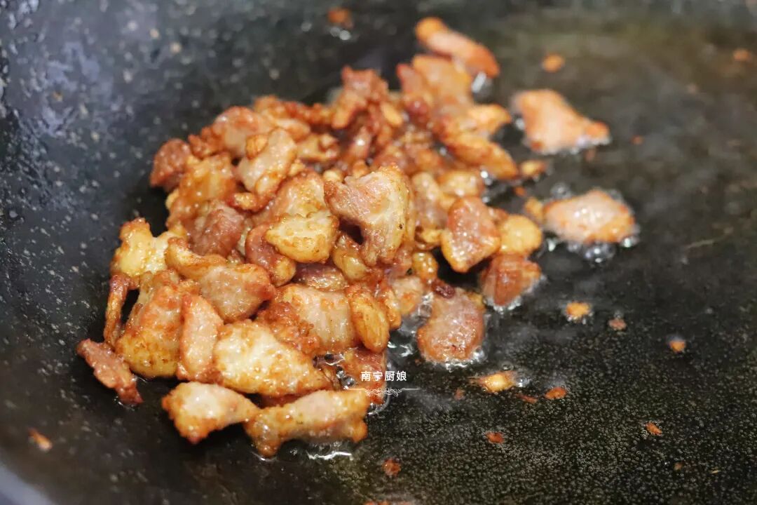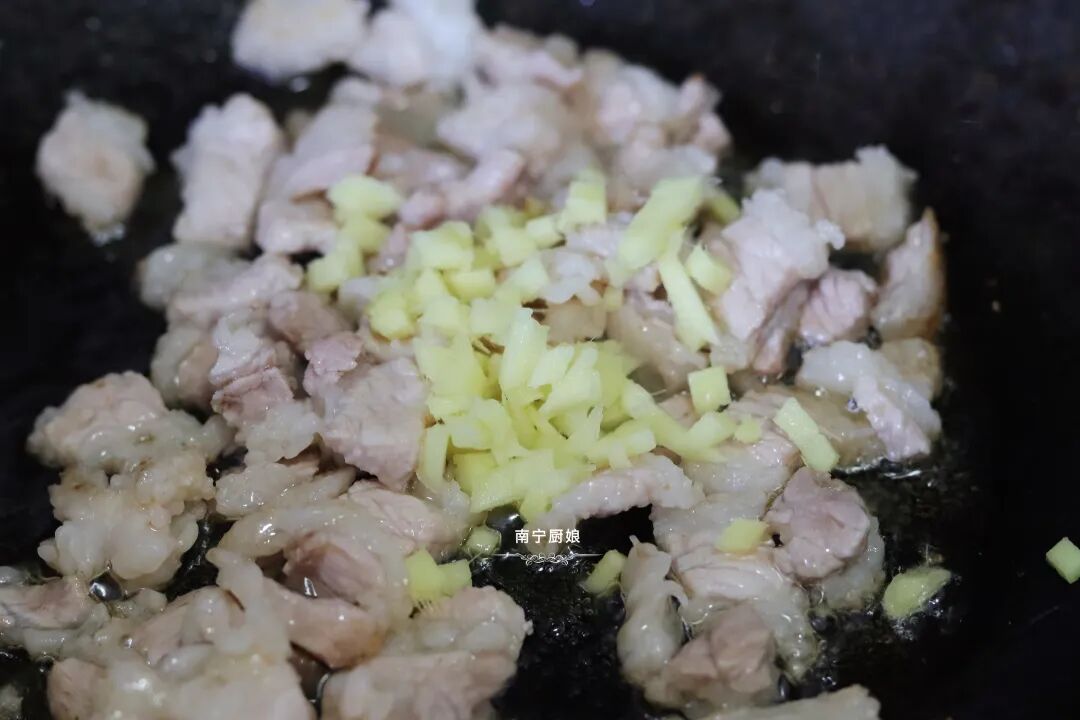 第二步,把锅洗干净后,开中火热锅,锅干了开始放油,等锅中油热,把五花肉丁和生姜末倒入锅中,接着放入适量料酒来去腥,把五花肉继续翻炒,直到五花肉丁炒熟出油,颜色焦黄,香味扑鼻。